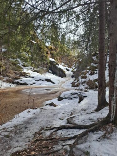 Наша цель — водопад. Ставим машину в конце поселка и заходим в лес. Видны следы зайца, а также волчьи следы. Жители сказали, что волки редко, но бродят! У поворота на водопад через речку Косолманку устроен красивый деревянный мостик.