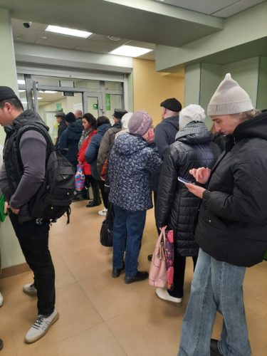 Другая картина предстала на следующий день, прямо со времени открытия офиса. В начале десятого в банке уже скопилась большая очередь. Я насчитала 16 человек, стоящих за талончиками. Прямо в «предбаннике» сотрудница банка помогала двум иностранным гражданам разрешить вопрос с переводом денег. Очередь за талонами двигалась быстро, но подходили всё новые клиенты.