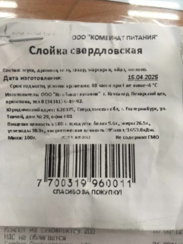 Сотрудники Евраза 18 апреля, в обед (12 часов), в столовой комбината купили слойку «Свердловскую». Откусив кусочек, потребитель почувствовал кислый, затхлый, твёрдый комок теста. На этикетке была информация, что слойка «Свердловская» изготовлена 15.04.2025. Срок годности 48 часов. Также перечислен состав продуктов (мука, дрожжи, соль, сахар…) и есть ссылка на нормативный документ, по которому слойка была изготовлена — ГОСТ 31806-2012 «Хлебобулочные замороженные и охлаждённые полуфабрикаты». Полуфабрикаты предназначены для реализации и последующей переработки в хлебобулочные изделия. Вопрос первый к изготовителю: из какого теста была сделана слойка? Если тесто сделали сами, тогда причём ссылка на ГОСТ 31806-2012?