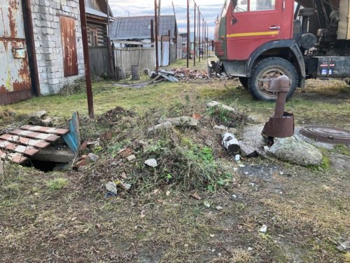 Кроме того, недалеко от колодца установлен пожарный гидрант, но к зимнему периоду он совершенно не готов, потому что не утеплён и в холода может просто перемёрзнуть. Сейчас яму, где находится гидрант, укрывают дощатым поддоном. Когда приезжали работники Горэнерго, жители улицы спросили, будет ли гидрант на зиму утеплен. На что работники ответили, что пока им такого задания не поступало.