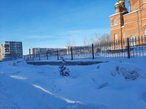 Несколько лет назад, и даже ещё в прошлом году, у забора нового храма посадили ёлочки и небольшие кустарники, которые прошлым летом уже цвели белыми мелкими цветочками.