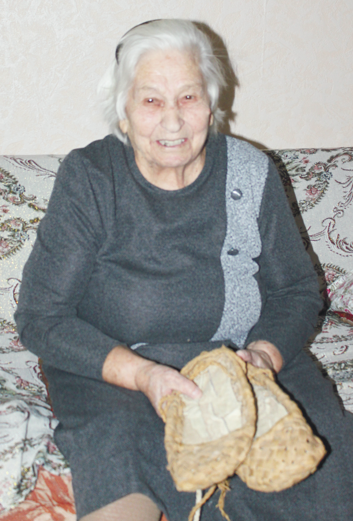 — Из еды в основном кар­тошка, что из дому привез­ли, да 600 граммов черного хлеба на рот. Из спецодеж­ды — пара лаптей на месяц, — женщина показывает на­стоящие лапти. — Не такие, как вот эти, вятские. У этих и лыко толще, и носки закру­глены. Те башкирские были, носок квадратный. Да и из­нашивались быстро. А мы все равно не унывали. Такая бригада собралась, что как бы ни умаялись, а все пели да шутили.