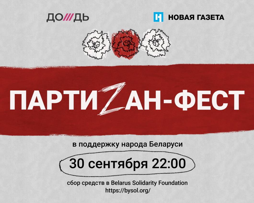 30 сентября в 22:00 на телеканале «Дождь»в прямом эфире программы «Би Коз» Михаил Козырев проведет онлайн-марафон в поддержку пострадавших от насилия на улицах Беларуси «Партизан-фест».