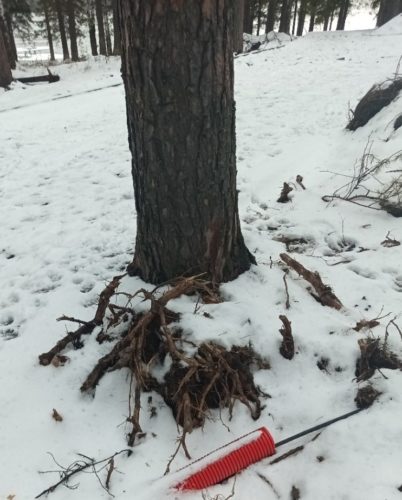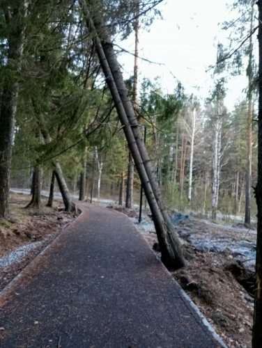 Когда прокладывали множество дорожек в лесной зоне, подрубили корни у многих деревьев. И сейчас некоторые из них наклонились и стали опасны для гуляющих.