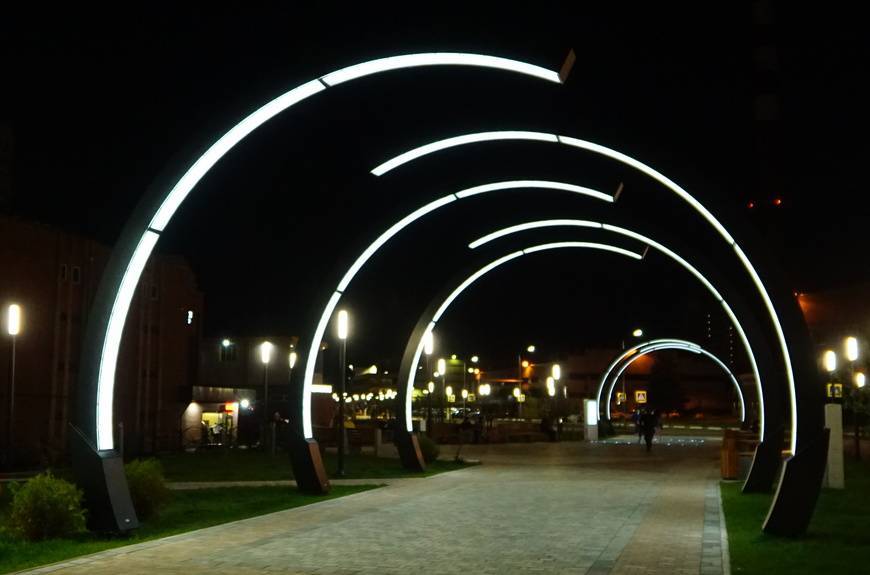 В Подольске тоже обу­строили парк и сквер, уста­новили фонтан и арки с под­светкой двух видов: одни как полусфера, другие прямоу­гольные. Также обустроили в городе пешеходную зону с игровыми площадками.