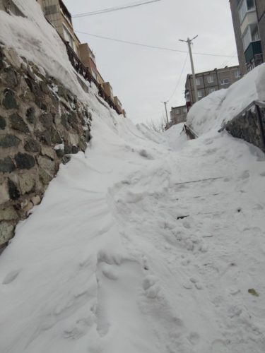 — Здесь когда-то была лестница, а сейчас направление. Люди проваливаются в снегу, —рассказывает Алла Петровна, показывая фотографии. — Снег с крыши балконов и с общежития кадетов, если упадёт на головы людей, то может случиться непоправимое. Над входом в подъезд, на козырьке метра полтора снега.