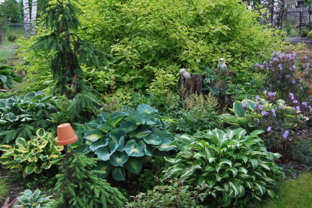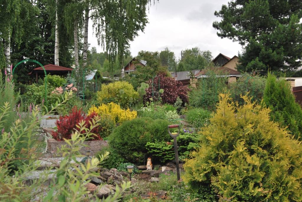И действительно, красо­та! На участке у Татьяны есть яблоня, клен, дуб, вишня, го­лубая сирень с пёстрыми ли­стьями, калина и еще много чего интересного. Очень много хвойников. Вписались в ландшафт и первозданные сосны и берёзы. Сейчас Та­тьяна хочет сделать в даль­нем уголке гравийный сад, уже подсадила туда много хвойников.