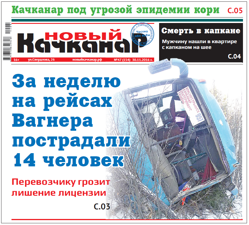 «За неделю на рейсах Вагнера пострадали 14 человек»: «Автобус КИА опрокинулся на Серовской трассе», «13 человек пострадали в столкновении «Форда» и грейдера», №47 от 30.11.2016;