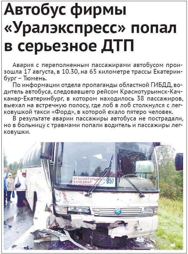«Автобус фирмы «Уралэкспресс» попал в серьезное ДТП», №32 от 19.08. 2015 г.;