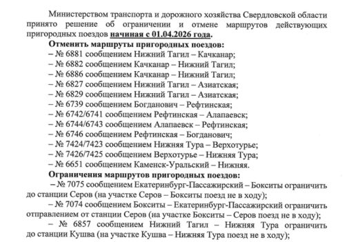 В Свердловской области с 1 апреля перестанут действовать 12 маршрутов. Это следует из письма гендиректора АО «Свердловская пригородная компания» Павла Кутловского.